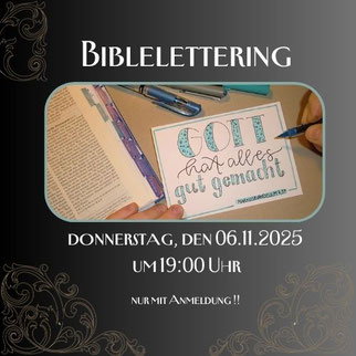 Das Wort Gottes ist Wahrheit und schenkt innere Freude und Frieden. Es ist lebendig und spricht heute zu uns, besser gesagt spricht der lebendige Gott zu uns. In diesem Workshop dürfen wir selbst kreativ werden wollen wir uns auf diesem Weg der Bibel nähern, uns einen Vers aussuchen und ihn individuell gestalten. Erfahrungsgemäß sind diese zwei Stunden wie im Flug vorbei und eine wunderbare Gelegenheit ganz bei sich und im hier und jetzt zu sein.