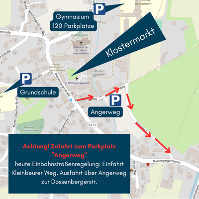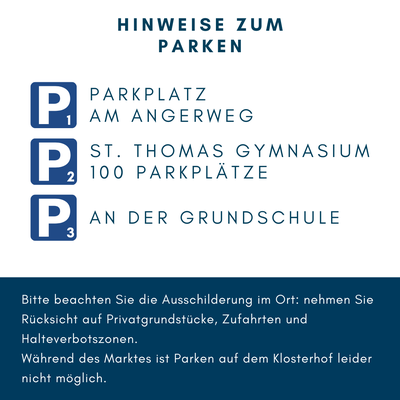 Bitte folgen Sie der Beschilderung im Ort P1 - Angerweg und P2 am St. Thomas Gymnasium (dort stehen über 100 Parkplätze für Sie bereit!) sowie P3 - Grundschule.